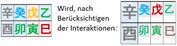 Wie Sie oben sehen können betrachte ich alle acht Zeichen des "Geburtsmomentes" eines Jahres, also auch des Monats, des Tages und der Uhrzeit, und deren Interaktionen. Das gibt meist ein ganz anderes Bild - hier den eines Metall-Hasen der sich nach außen hin als Holz-Schlange gibt.